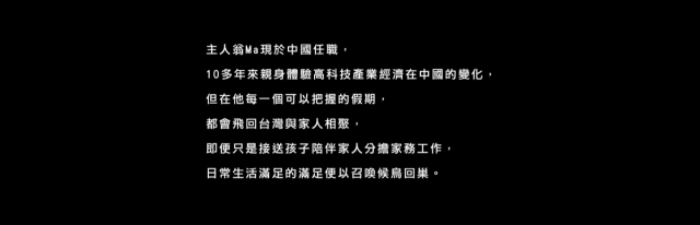 主人翁Ma現在中國任職,10多年來親身體驗高科技產業經濟在中國的變化,但在他每一個可以把握的假期,都會飛回台灣與家人相聚,即便只是接送孩子陪伴家人,日常生活中的滿足便足以招換候鳥回巢。