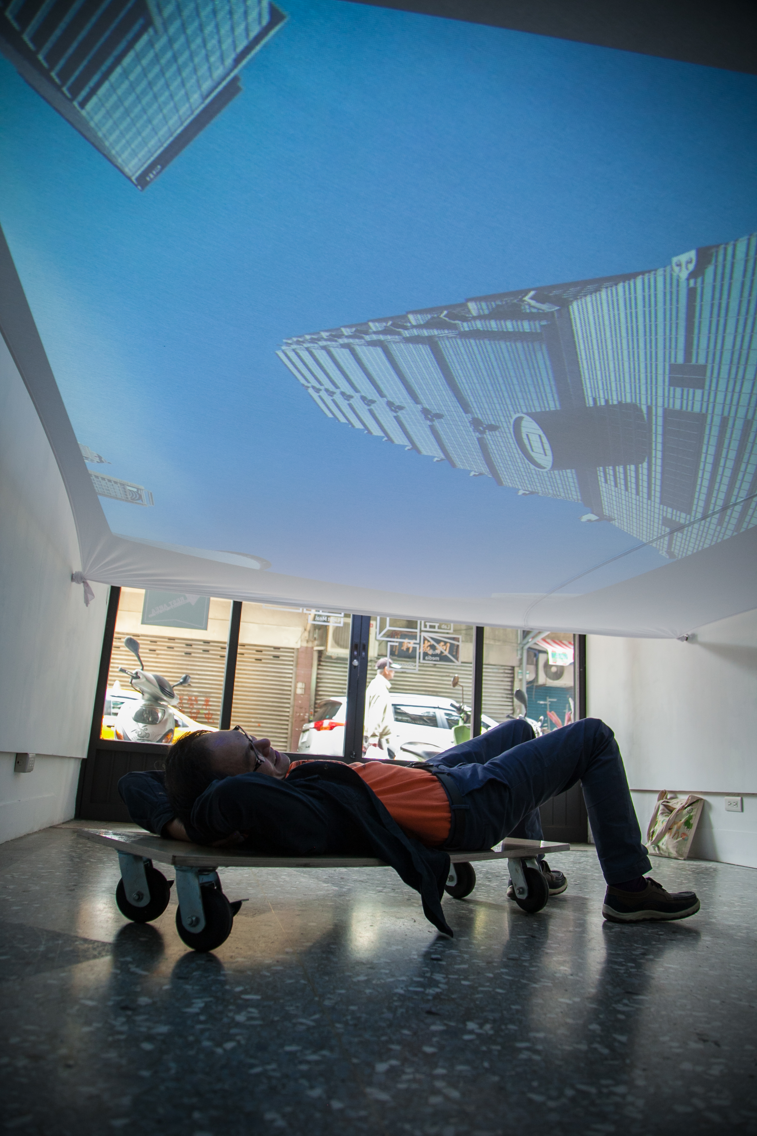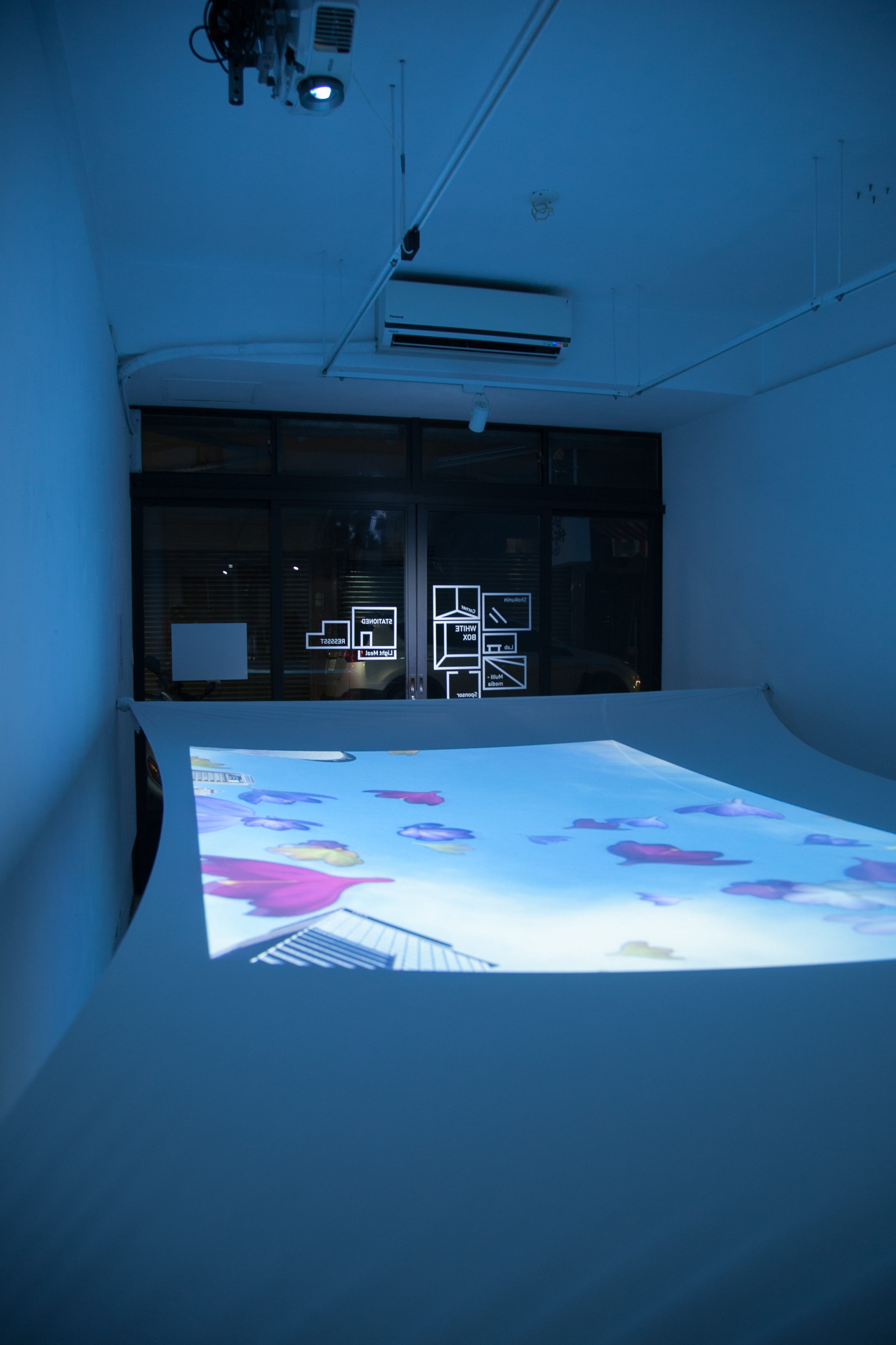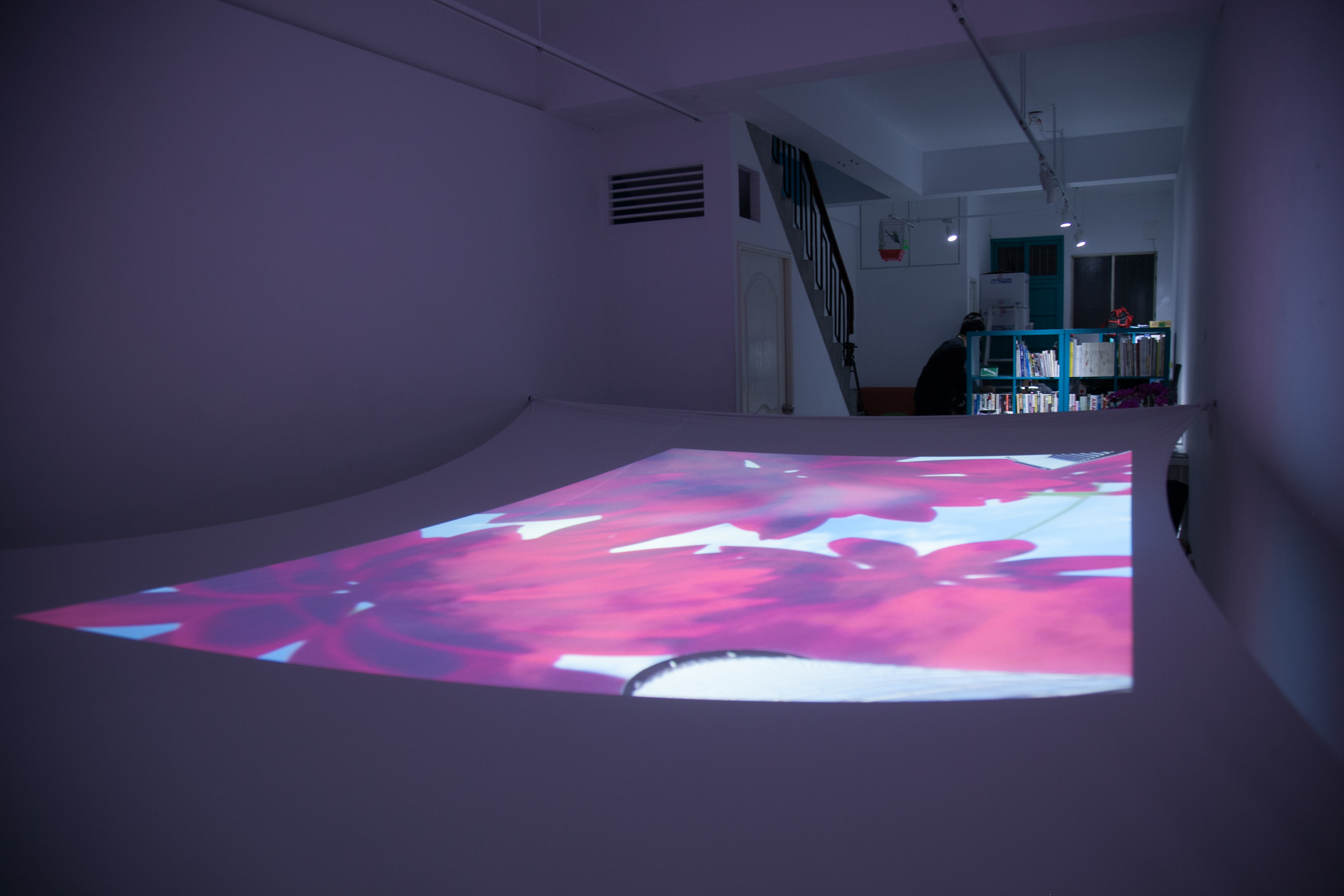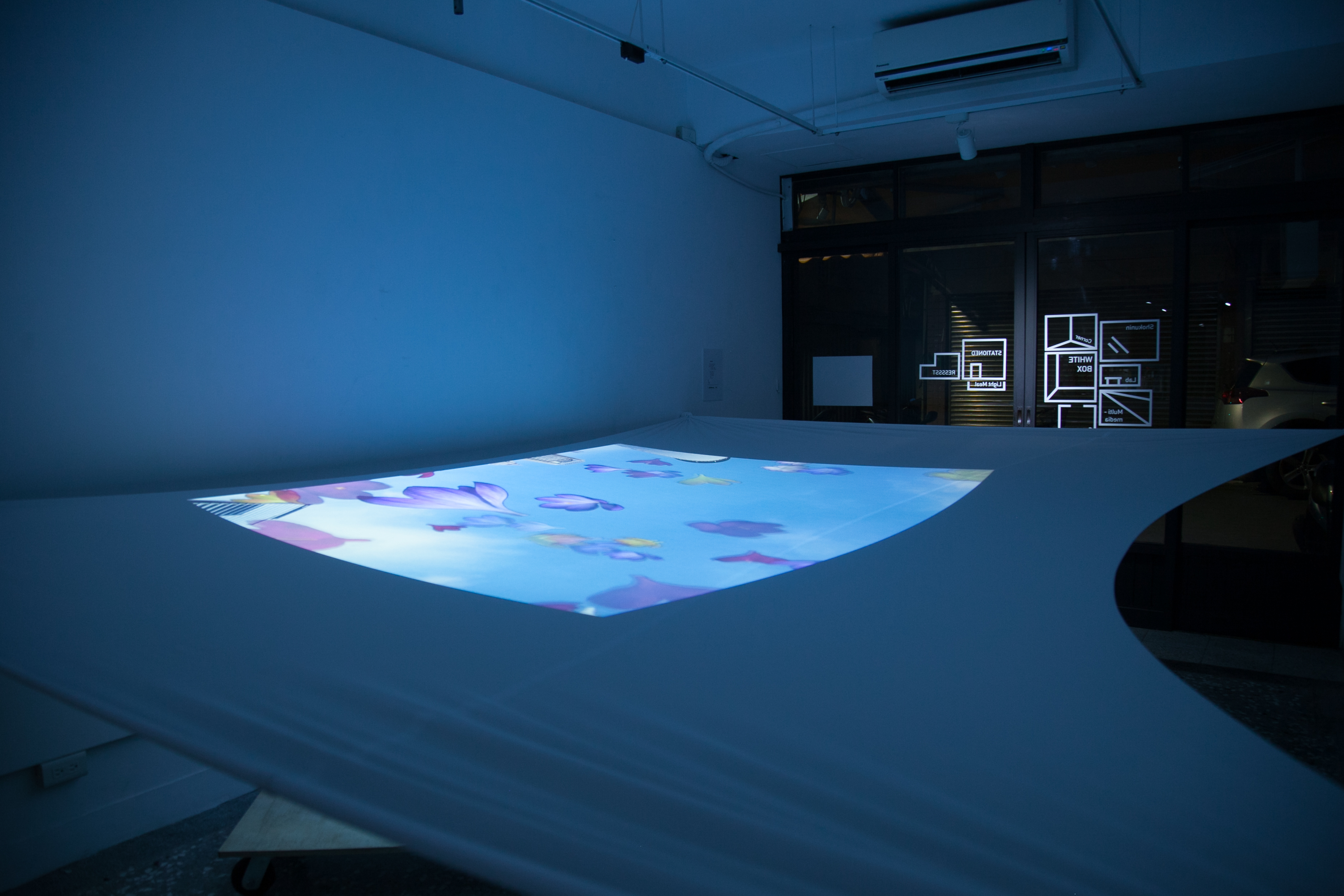 投影裝置、 帶輪滑板 投影材質:背投影/投影萊卡布料環境控制:現場需要設置維護員,避免參與者移動時相撞