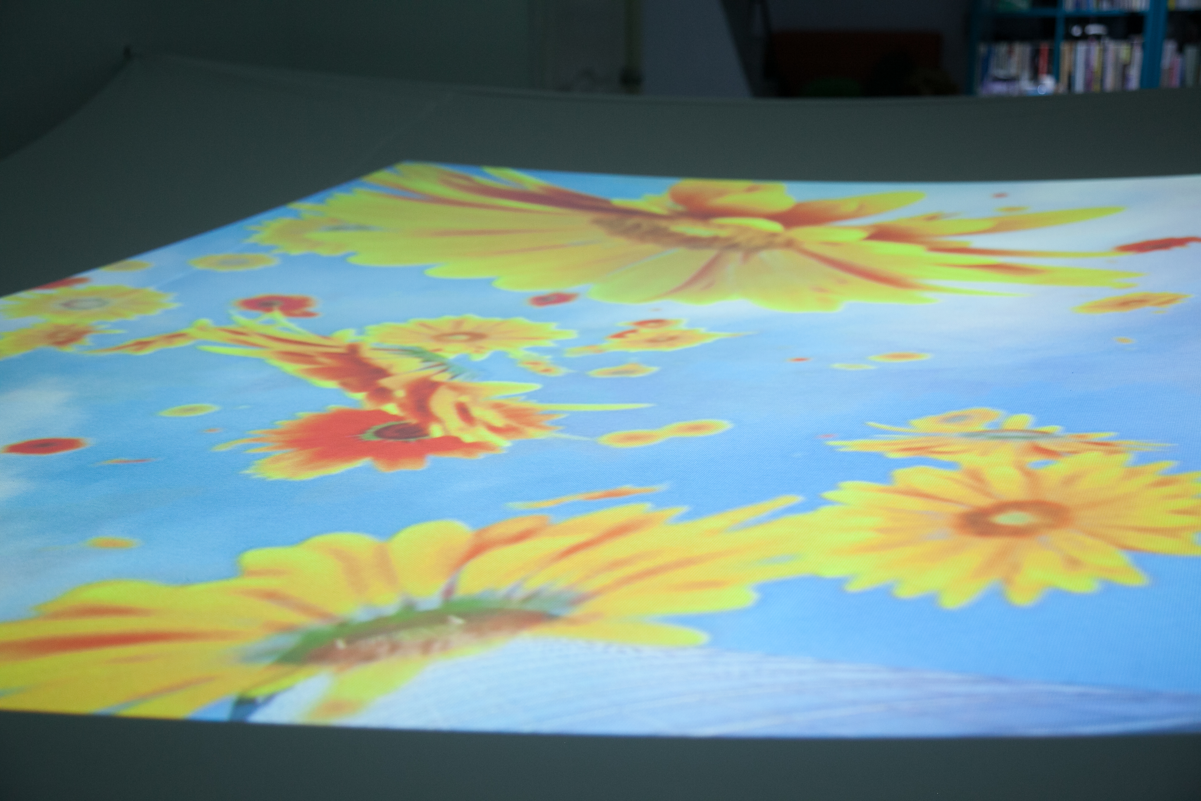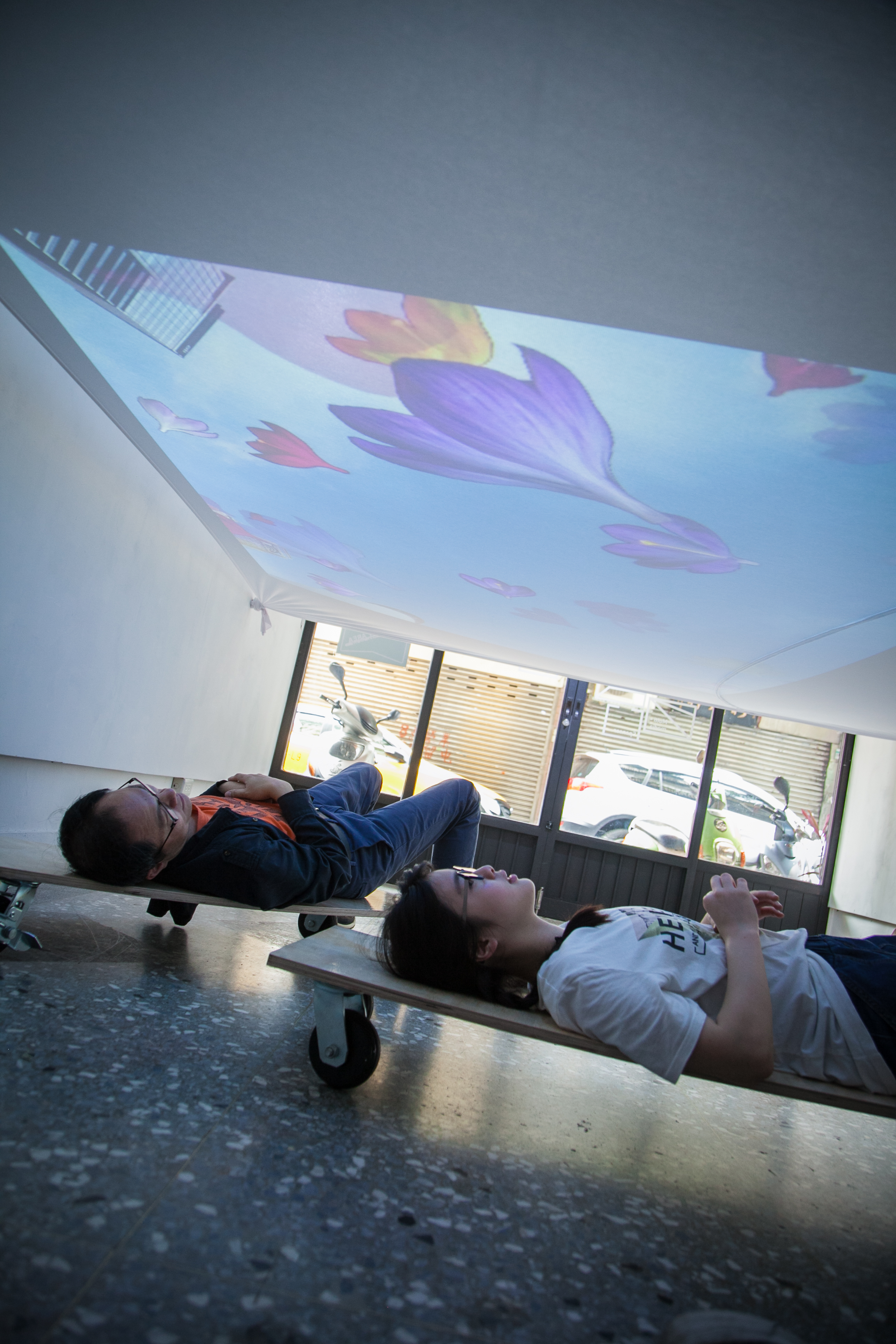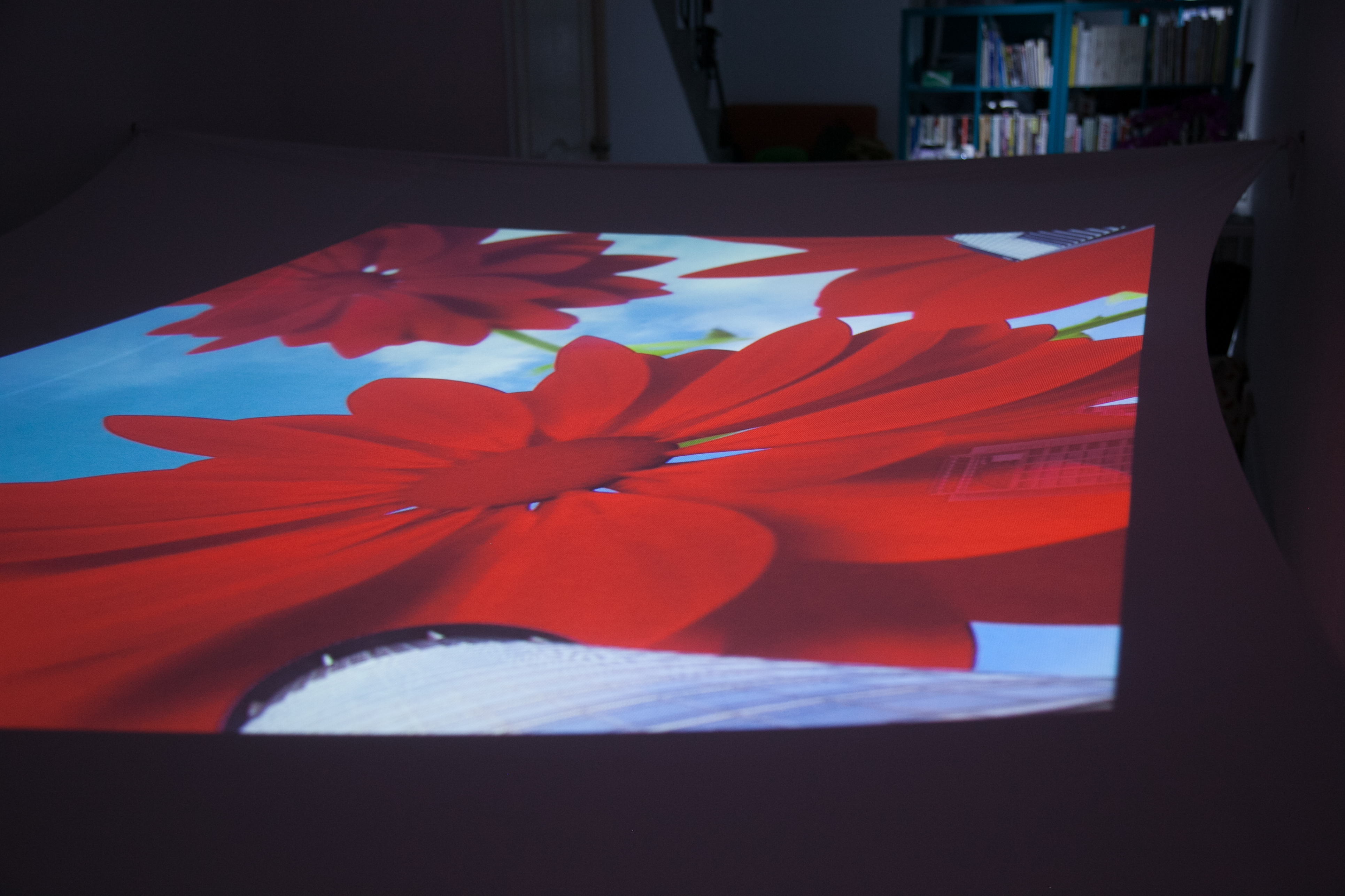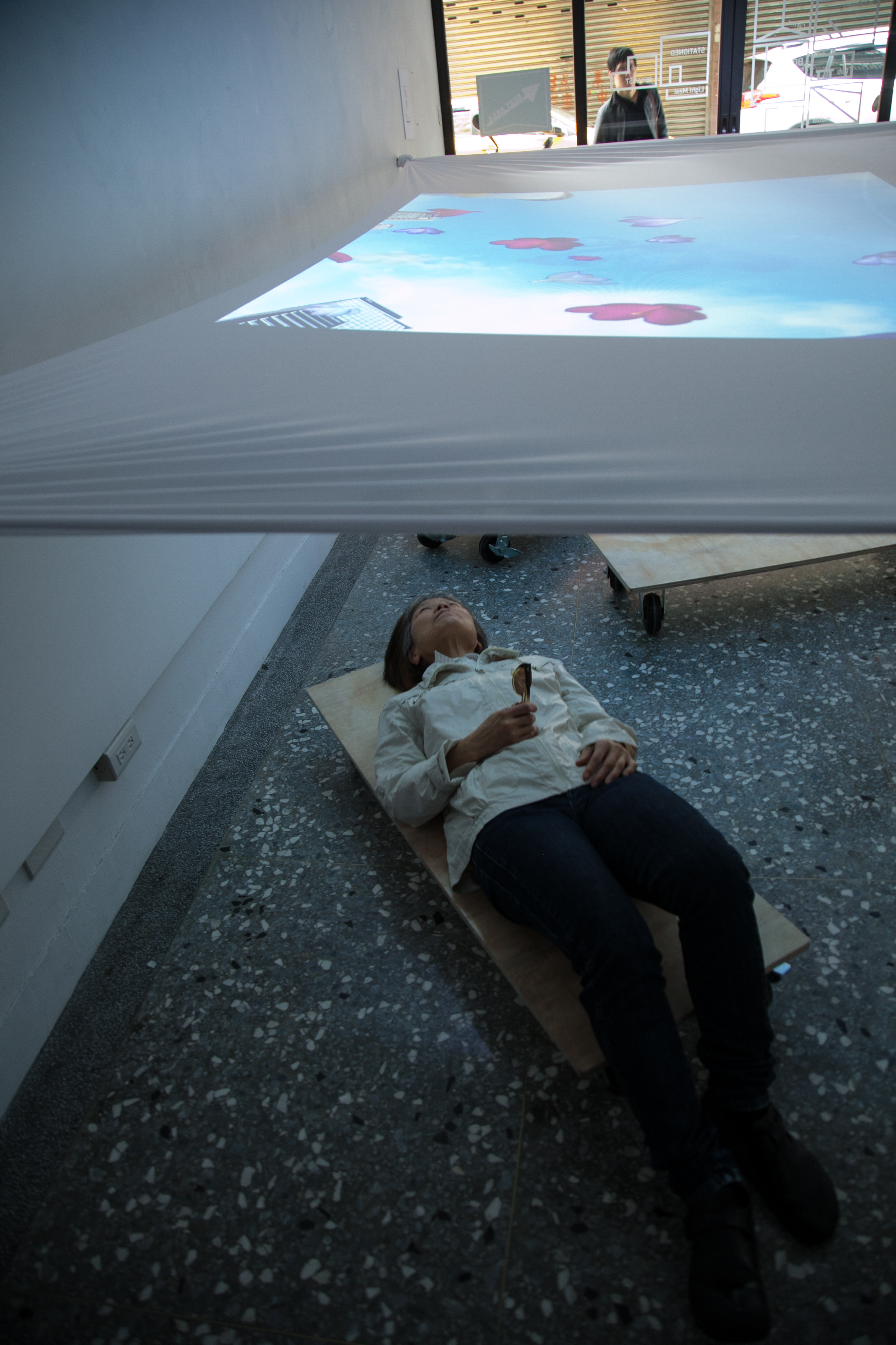 投影裝置、 帶輪滑板 投影材質:背投影/投影萊卡布料環境控制:現場需要設置維護員,避免參與者移動時相撞